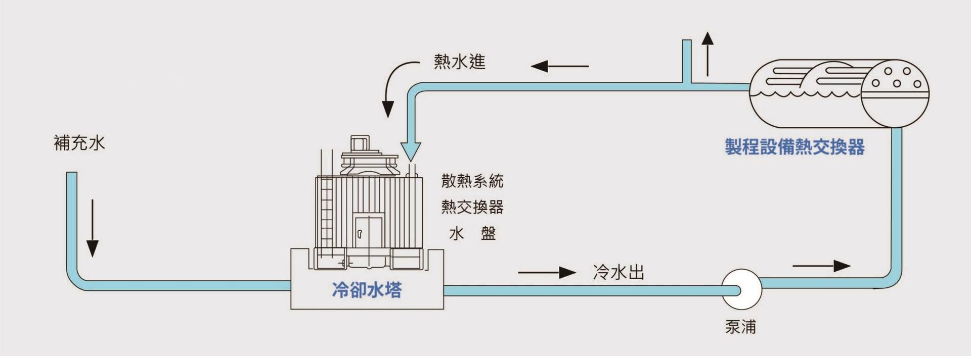 冷却水塔运行→冷却水进入机械设备降温→热能蒸发大量